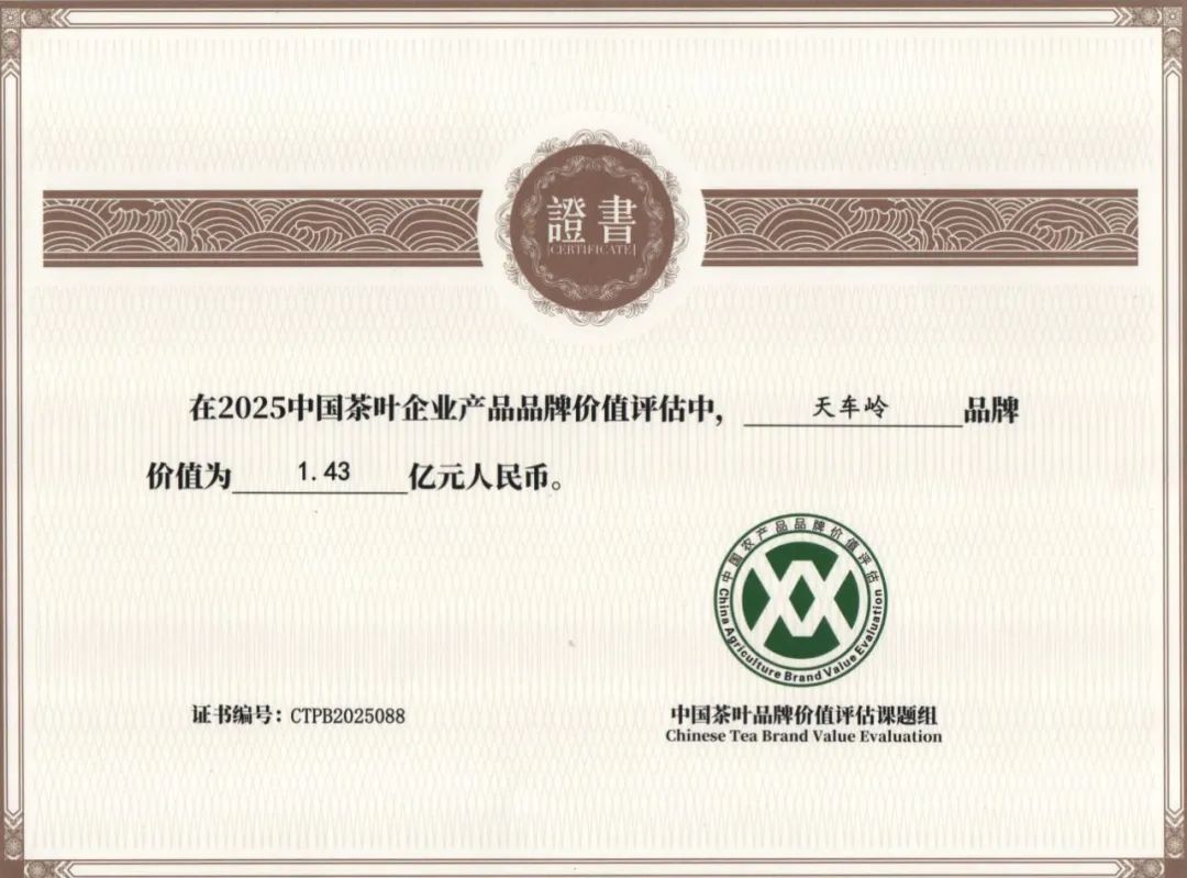 在2025年中國(guó)茶葉企業(yè)產(chǎn)品品牌價(jià)值評(píng)估中,湖南臨湘市白石千車(chē)嶺茶業(yè)有限公司的“天車(chē)嶺”品牌憑借卓越的品質(zhì)與深厚的文化底蘊(yùn),品牌價(jià)值達(dá)1.43億元人民幣。這一成績(jī)不僅彰顯了天車(chē)嶺品牌在行業(yè)中的強(qiáng)大競(jìng)爭(zhēng)力,也為其未來(lái)發(fā)展奠定了堅(jiān)實(shí)基礎(chǔ)。